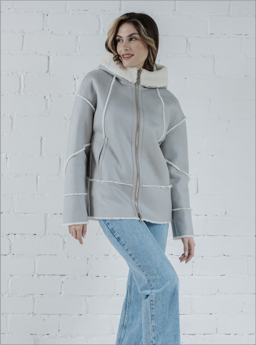 Эко дубленка «Лара» капюшон серый/белый цвета серый/белый